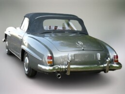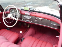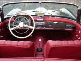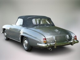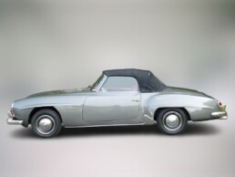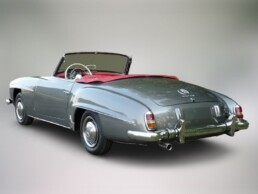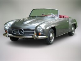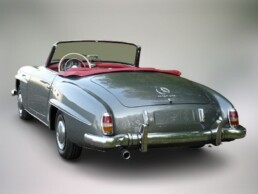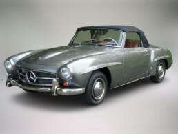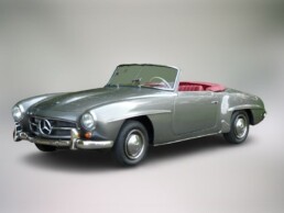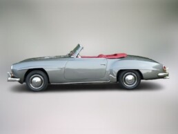 En 1955, dans la vague qui a suivi la victoire de Stirling Moss aux mille miles au volant d’une Mercedes 300 SLR, est née sous le crayon du dessinateur Karl Wilfret la 190SL petite sœur de la légendaire 300SL.